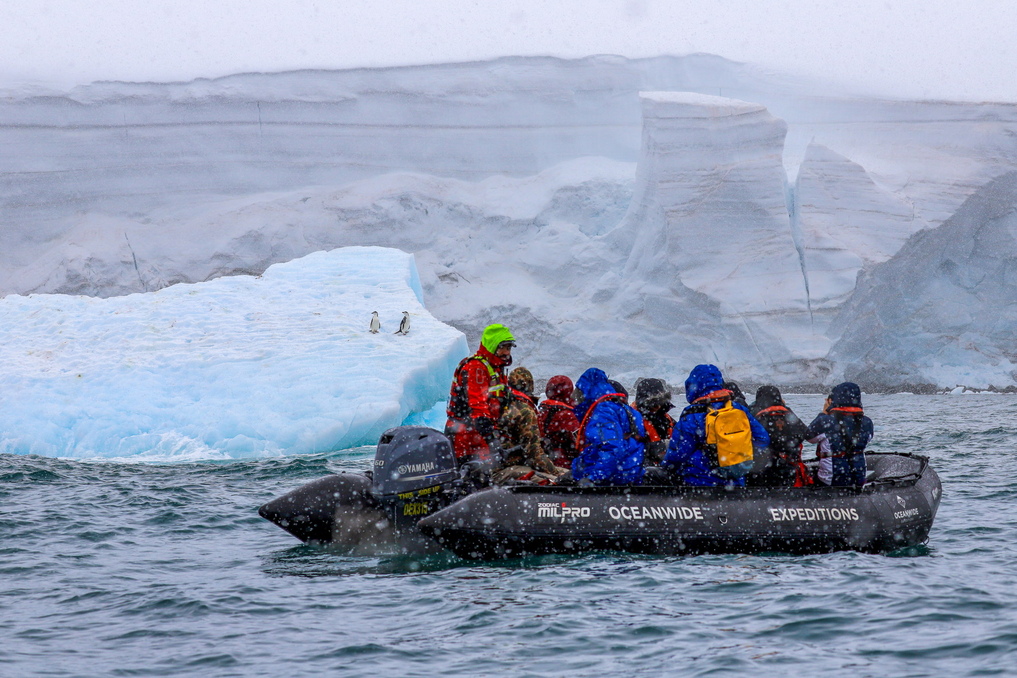 І з’являється проблема: гіди майже заносять туристів у зодіак. Але й це ще не все — далі хвилі… здається, що невисокі, але коли ти в маленькому човні, усе стає не так цікаво — його підкидає й роняє, а вас зверху обливає крижана вода. Тут головне тримати камеру у сухому місці (на кораблі нам видали спеціальні герметичні сумки, але можна було користуватися також власною). Потім треба вийти на невелику платформу на борту корабля, а човник у порівнянні з нею підскакує метр вгору — метр вниз… таке собі задоволення. А небо все таке ж блакитне, сонце світить. Тож під час поїздки важлива не лише сонячна погода, а й слабкий вітер.