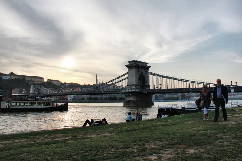 Вдали в лучах закатного солнца виднеется замок Буда. Проходим белый мост и подходим к цепному мосту Сечени, который был открыт в 1849 году, став первым постоянным мостом через Дунай.