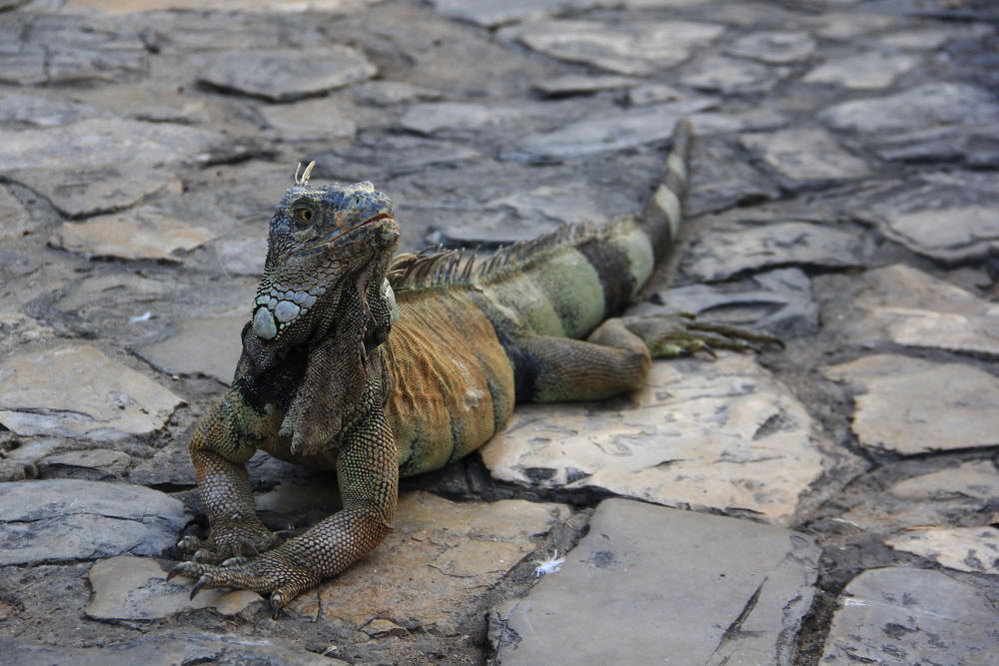 На самом деле только в этом парке есть много игуан и их туда специально привезли. И с голубями они вполне мирно сосуществуют. Когда игуан кормят салатными листьями - голуби тырят салат!