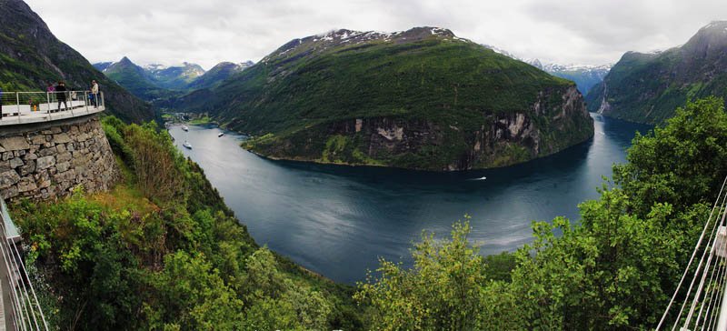 Вверху Орлиной дороги расположена смотровая площадка, с которой открывается прекрасный вид на Гейрангер фьорд, водопад Семь сестер и альпийской фермы Книвсфло.
