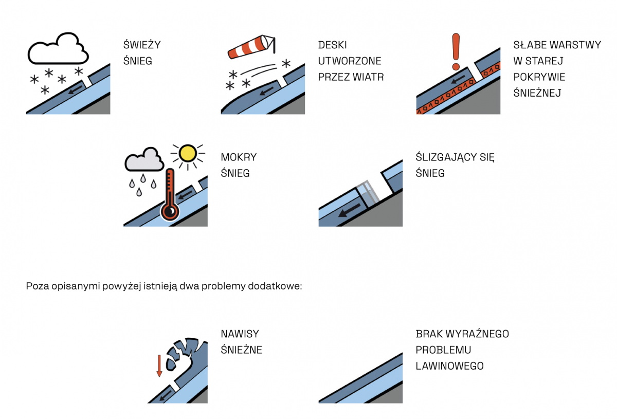 EAWS визначила п'ять проблем для опису типових нестабільностей снігового покриву, що виникають на лавинонебезпечній місцевості: