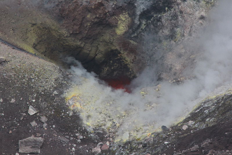 Запахи, когда ветер дует в нашу сторону, тоже не особо хорошо переносятся. От серы режет глаза. А где-то внизу в самом жерле вулкана виднеется что-то красное постоянно меняющее форму – магма.